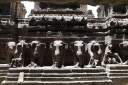 入り口の門の左右に見ごたえのあるレリーフがあり、門をくぐると左右の広場に大きな象の像があります。正面にはナンディー堂があり、その奥に大きな前殿と本殿があります。本殿の周りはグルリと掘り下げてあり、周りの岩の壁には回廊廻らされていて隙間なく彫刻が彫られています。本殿の外壁にもヒンズー教のシバ神の神話や「マハーバラタ」「ラーマーヤナ」の場面が彫られていました。本殿を支えるようにたくさんの象も彫られています。