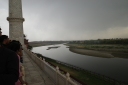 タージマハル本体の前まで来ると、パルさんは待っているから中を見て来てとのことで、待ち合わせの時間と場所を聞いて、左側の階段を上りました。ここにもチェックのゲートがあり、靴カバーを貰って被せ、建物の正面から入ります。近くで見るとただ真っ白な建物ではなく赤や黄色、緑の石をはめ込んだ象嵌細工やレリーフが施されていました。人が多くて係員が止まらないよう呼び掛けています。真ん中にはムガル帝国の皇帝シャー・ジャハンと妃ムムスターズ・マハルの棺が安置されています。棺を囲む柵の外側を1周してから棺の正面に行って棺を見ることができました。周りの柵の造りが繊細で、棺も象嵌細工の模様がとても綺麗です。棺を見た後は裏から出ました。裏にはヤムナ川がゆったりと流れて対岸に本来皇帝が対になる自分のお墓を建てたかった土地が広がっていました。正面の階段を下りてパルさんと合流し、大楼門に戻りました。最後にもう一度ゆっくりタージマハルの姿を眺めて目に焼き付けて門をくぐり出口へ。出口のゲートも人が多くて出るのに時間がかかりました。コインを入れる機械が壊れていて別の機械の列に移ってようやく出られました。