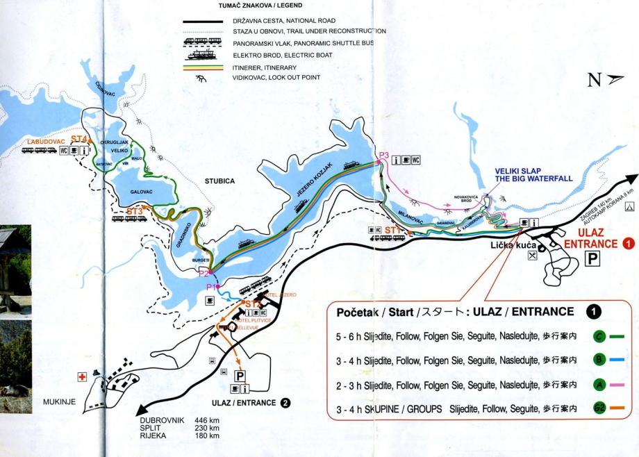 シュプリャラ洞窟は上に向かって穴が開いていて、急な階段を登るとST1のバス停に続く遊歩道に出ました。再び階段を下りてカルジェロバッツ湖の湖岸の遊歩道を歩き、今日最初に下りた九十九折れの道を登って3時17分、エントランス1に戻りました。