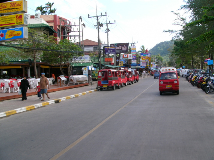 トゥクトゥクというタクシーを呼んでもらって町に行きました。荷台を座席に改装したものです。4人で乗って(何人乗っても同じみたい)100バーツでした。